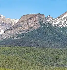 Saddle Mountain is located in the Bow Valley within Banff National Park, and it is part of the Bow Range of the Canadian Rockies. Lake Louise townsite is situated 4 kilometres (2.5 mi) to the northeast and the Continental Divide is 6 kilometres (3.7 mi) to the west. The nearest higher neighbor is Fairview Mountain, 1.2 km (0.75 mi) to the northwest.[3] Precipitation runoff from Saddle Mountain drains into tributaries of the Bow River. Topographic relief is modest as the summit rises over 600 meters (1,968 ft) above Paradise Creek in one kilometer (0.6 mile) and nearly 900 meters (2,953 ft) above Bow River in 3 km (1.9 mi). The peak is visible from Alberta Highway 1 to the east,[2] and is prominent in the iconic photographs taken from Morant's Curve.