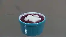 ![]() Sagu de vinho served in a ramekin, with a white cream on top of it. | |