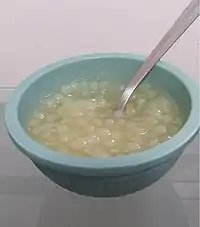 Sagu (from Malay sago or sagu) originally referred to starch extracted from Southeast Asian sago palms (saguzeiro in Portuguese), which is usually made into sago pearls in Southeast Asian cuisine.[2][6] After cassava (native to South America) was introduced to Southeast Asia during the colonial era, it became an alternative starch source for making pearl sago, resulting in the name "sagu" or "sago" being used interchangeably for cassava, potato or sago starch in European cuisine.[7][8][9][10] The making of tapioca balls was introduced to Brazil after the arrival of European immigrants, which became known as sagu, despite being made from native cassava starch.[2]
