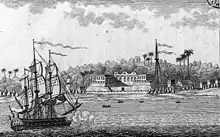 Repeated flooding prompted the removal of the fort to the island known to locals as Ndar in 1659.[4] The island was uninhabited at the time,[13] supposedly because the local people believed it to be haunted by spirits.[4] The Diagne of Sor, the local leader, permitted French settlement on the island for annual payments of "three pieces of blue cloth, a measure of scarlet cloth, seven long iron bars, and 10 pints of eau de vie."[4]