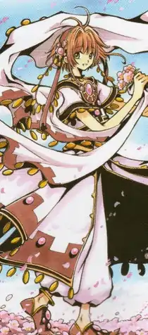 First introduced in Tsubasa: Reservoir Chronicle, Sakura is the princess of the Kingdom of Clow. A force fragments her soul, including her memories, into feathers, which are scattered across various parallel worlds.[14] To retrieve the feathers and save her life, she and Syaoran go to Yūko Ichihara, who gives them Mokona Modoki to help them travel to parallel worlds. The cost for her help is Sakura's memory of Syaoran, which causes him to be absent from any memories restored to her.[15][16] Sakura is initially confused, and constantly tired, but she grows stronger as she regains her feathers.[17] She becomes very friendly with the group's new members, Fai D. Flowright, Kurogane and Mokona, and she grows close to Syaoran again.[18] Even though she notices that she has forgotten somebody from her memories, whenever Sakura realizes the one missing is Syaoran, her memories revert to before her realization.[19] Over time, she also starts to recover various abilities, including seeing spirits of nature, ghosts, and visions of the future.[20][21]