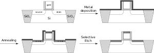 The salicide process begins with deposition of a thin transition metal layer over fully formed and patterned semiconductor devices (e.g. transistors). The wafer is heated, allowing the transition metal to react with exposed silicon in the active regions of the semiconductor device (e.g., source, drain, gate) forming a low-resistance transition metal silicide. The transition metal does not react with the silicon dioxide nor the silicon nitride insulators present on the wafer. Following the reaction, any remaining transition metal is removed by chemical etching, leaving silicide contacts in only the active regions of the device. A fully integrable manufacturing process may be more complex, involving additional anneals, surface treatments, or etch processes.