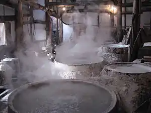 Salt production during the Ming period mainly took place in China's coastal regions and salt lakes. Although there were different techniques to obtain salt, boiling seawater and evaporating seawater under the sun were the two popular methods of isolating salt. Both techniques of salt production required dry and sunny weather. During Ming times, boiling seawater was the most prevailing technique. Salt producers laid down reeds and straws to absorb and concentrate seawater and then boiled it to isolate the salt grains.[30] The technique of sunshine exposure was occasionally used in Fujian and was not commonly applied nationally until the late Ming period.[31] Saltern households were generally called yan hu(盐户), and specifically, those who boiled seawater were called zao hu(灶户). Other techniques were applied in inland regions of China. In Yunnan, salt was obtained through the mining of saline rocks. In Shanxi and Shaanxi, salt was gathered in the summer when the salt lake dried up. And in Sichuan, brine wells were dug and then the brine was boiled. Household that boiled brine also had to obtain fuel, in the form of natural gas or burning firewood and straw, in order to heat up their furnaces.[30]