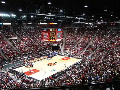 Prior to the opening of the arena, men's basketball played its home games primarily at Peterson Gymnasium (located across the street from Viejas Arena and the current home to the Aztec women's volleyball team), and, for more than 30 years, played on-and-off at the San Diego Sports Arena.[10][11][12]