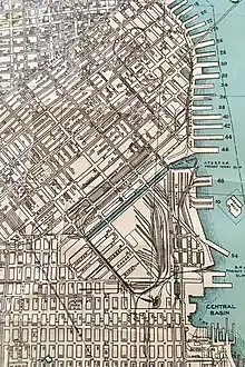 The railroad connected the Port of San Francisco to many waterfront docks and to industries and warehouses which were adjacent to the waterfront. In its early years, it operated dual-gauged track to accommodate the North Pacific Coast Railroad and South Pacific Coast Railroad.[3] It would eventually have 67 miles (108 km) of trackage and general offices in the Ferry Building. Its function was to switch railroad cars from four major railroads to points along its system and vice versa. At the southern portion of the line, a track along King Street (passing the location now occupied by Oracle Park) connected with the Southern Pacific. A train ferry slip at Pier 43 allowed interchange with the Northwestern Pacific, the Western Pacific, and the Atchison, Topeka & Santa Fe railroads. To reach its northern terminus in the Presidio, the line passed through Fisherman's Wharf, Aquatic Park, and Fort Mason Tunnel.