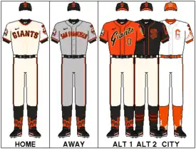 1. "San Francisco Giants Uniforms 1958 - Present". SFGiants.com. MLB Advanced Media. Archived from the original on October 24, 2019. Retrieved October 24, 2019.