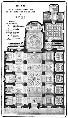 When the Saracens burned the Abbey of Farfa in 898, a group of refugees settled in Rome.[5] Some monks remained in Rome even after their abbot Ratfredus (934–936) rebuilt the abbey. By the end of the tenth century, the Abbey of Farfa owned in Rome churches, houses, windmills and vineyards. A bull of Holy Roman Emperor Otto III in 998 confirms the property of three churches:[6] Santa Maria, San Benedetto and the oratorio of San Salvatore. When they ceded their property to the Medici family in 1480, the church of Santa Maria became the church of Saint Louis of the French. Cardinal Giulio di Giuliano de' Medici commissioned Jean de Chenevières to build a church for the French community in 1518.[7] Chenevières' design was for an octagonal, centrally planned edifice.[8] Building was halted when Rome was sacked in 1527, and the church was finally completed in 1589 by Domenico Fontana and Giacomo della Porta, who designed the façade, according to an entirely different design. The church was consecrated by the Cardinal François de Joyeuse, Protector of France before the Holy See, on 8 October 1589.[9] The interior was restored by Antoine Dérizet between 1749 and 1756.