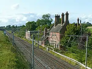 Although in a country area and in some distance from the village it served, the station building was in an ornate Jacobean style with ornate gable ends and, on the entrance side, a substantial Porte-cochère.[3] This was for the convenience of Dudley Ryder, 2nd Earl of Harrowby,[3] who was about to have a new Jacobethan country house built in nearby Sandon Park. There was a decorated timber awning and, on the opposite platform, a small but similarly elegant waiting-room.