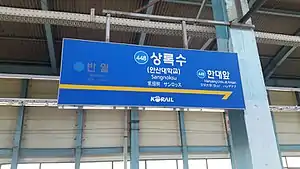 Sangnoksu station is a railway station on Seoul Subway Line 4. The station is located in Ansan-si, Gyeonggi-do.[1] It is located between Banwol station and Hanyang Univ. at Ansan station. Its station subname is Ansan Univ.[2]