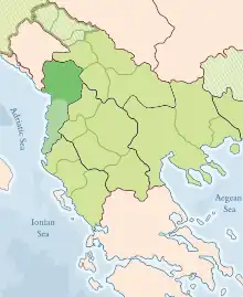 The Albanian Malisors (highlanders) lived in three geographical regions within İşkodra sanjak.[15] Malesia e Madhe (great highlands) with its religiously mixed Catholic-Muslim five large tribes (Hoti, Kelmendi, Shkreli, Kastrati and Gruda) and seven small tribes; Malesia e Vogel (small highlands) with seven Catholic tribes such as the Shala, Shoshi, Toplana, Nikaj; and Mirdita, which was also a large powerful tribe that could mobilise 5,000 irregular troops.[15] The government estimated the military strength of Malisors in İşkodra sanjak as numbering over 30,000 tribesmen and Ottoman officials were of the view that the highlanders could defeat Montenegro on their own with limited state assistance.[16] Ottoman control over the highland areas of İşkodra sanjak was limited.[17] In the 1880s, from an Albanian point of view the sanjak of İşkodra belonged to the region of Gegënia.[18]