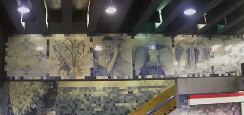 The government of Portugal gave one of the first works of art that adorn the stations to Metro S.A. in the 1990s. This work is called Azulejos para Santiago and is composed by tiles in diverse blue and white tones.