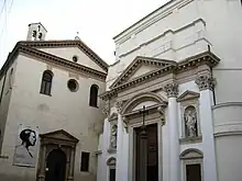 To the left of the facade when facing the entrance of the church is the Oratory of San Rocco with 16th-century frescoes.
