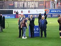 Hostikka receiving bronze medal with Pogoń Szczecin at the end of the 2020–21 Ekstraklasa season.