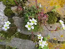 Stem bulbiferous; leaves nerved, the lower ones spatulate, quite entires, the upper ones palmate three of five-cleft, in the flowering branch remote, linear.—This has the appearance of the preceding [Saxifraga hypnoides, mossy saxifrage], and is scarcely distinct from it.—Found on the top of Mount Atlas.[6]