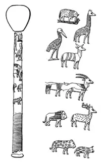 The upper area of the handle was decorated all around with pictures of animals. An elephant was depicted at the top, stamping on two snakes. The significance of this is disputed.[6] After this, there is a giraffe, a saddle-billed stork, several bovids and carnivores, such as a lion and a leopard.