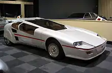 Sbarro also collaborated with Pierre Cardin for a mid-engined, turbocharged version of the Stash released in Paris 1975.[7] While the 109 kW (148 PS; 146 hp), 1.8-litre Volkswagen K70 engine provided impressive performance for the time, Cardin's special interior with its striping, special upholstery, and zip-fastened pockets was the main attraction.[8] All Sbarros have been extremely limited production vehicles - for instance, only five Stash seem to have been built, even though at least three engines, two bodystyles, and the Pierre Cardin special edition were on offer.[9]