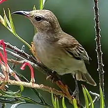 The smallest honeyeater native to Australia,[17] the scarlet myzomela is a distinctive bird with a compact body, short tail and relatively long down-curved black bill and dark brown iris. It is between 9 and 11 cm (3.5 and 4.3 in) long, with an average wingspan of 18 cm (7.1 in) and a weight of 8 g (0.28 oz).[18] It has relatively long wings for its size; when the wings are folded, the longest primary feathers reach over half the length of the tail.[10] It exhibits sexual dimorphism, with the male much more brightly coloured than the female.[18] The adult male has a bright red (scarlet) head, nape and upper breast, with a narrow black stripe from beak to eye and a thin black eye-ring. The red plumage extends as a central stripe down the back and rump. On its breast, the red becomes more mottled with grey towards the belly and flanks, which are grey-white.[18] The sides of the breast are brown-black.[19] The mantle and scapulars are black and the upperwing a dull black, with white edges to the secondary covert feathers. The tail is black above and dark grey below. The underwing is white with a dark grey trailing edge and tip.[18] The female has a brown head and neck, darker on top and lighter and greyer on the sides, with a pale grey-brown throat and chin. It sometimes has pinkish or reddish patches on the forehead, throat and cheeks. The upperparts are brown, sometimes with scarlet patches on the uppertail coverts. The tail is blackish-brown with yellow fringes to all but the central pair of rectrices. The wings are blackish-brown.[18] The female has a yellowish or brownish base to its black bill. Moulting takes place over spring and summer.[20]