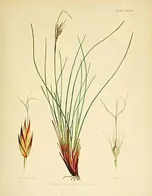 Schoenus is a predominately austral genus of sedges,[2] commonly known as bogrushes,[3] or veldrushes in South Africa. Species of this genus occur mainly in South Africa (some 44 species), Australia (some 70 species) and Southeast Asia.[4] Others are found in scattered locations worldwide, from Europe (2 species) to Asia, North Africa (1 species) and the Americas.[5][6][7][8][9][10] Three species occur in the peatlands of southern South America, including S. antarcticus which is found in Tierra del Fuego, where it forms a component of hyperhumid Magellanic moorland.[11]