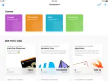Schoolwork is companion app for Classroom, announced during Apple's edtech event in March 2018 and released in June 2018.[3][4][5] The free app allows teachers to distribute documents, iBook files, web links, and assignments through ClassKit (such as Kahoot! quizzes) with due dates.[6][7] Students can hand-in those assignments via the app for teachers to view and provide feedback via the app.[8]