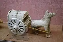 Modern archaeology has led to the discovery of Han artwork portraying inventions which were otherwise absent in Han literary sources. This includes the crank handle. Han pottery tomb models of farmyards and gristmills possess the first known depictions of crank handles, which were used to operate the fans of winnowing machines.[59] The machine was used to separate chaff from grain, but the Chinese of later dynasties also employed the crank handle for silk-reeling, hemp-spinning, flour-sifting, and drawing water from a well using the windlass.[59] To measure distance traveled, the Han-era Chinese also created the odometer cart. This invention is depicted in Han artwork by the 2nd century CE, yet detailed written descriptions were not offered until the 3rd century.[60] The wheels of this device rotated a set of gears which in turn forced mechanical figures to bang gongs and drums that alerted the travelers of the distance traveled (measured in li).[61] From existing specimens found at archaeological sites, it is known that Han-era craftsmen made use of the sliding metal caliper to make minute measurements. Although Han-era calipers bear incised inscriptions of the exact day of the year they were manufactured, they are not mentioned in any Han literary sources.[62]