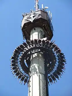 Scream is a gyro drop tower at the Heide Park amusement park in Soltau, Lower Saxony, Germany. It was constructed at a cost of €7.5 million by Intamin between October 2002 and April 2003, repurposing the structure of the Aussichtsturm II observation tower which opened in 1992. With a height of 103 metres (338 ft), riders plunge down 71 metres (233 ft) up to speeds of 98.3 kilometres per hour (61.1 mph).[1] Scream, which has a diameter of 2.8 metres (9 ft 2 in), stands on a foundation of 8 metres (26 ft) in depth and 10 metres (33 ft) in diameter. The travelling time is 82 seconds, two seconds of which are the actual fall. The deceleration phase lasts for 5.5 seconds.