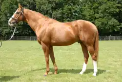Selkirk (February 19, 1988 – January 3, 2013)[2] was an American-bred Thoroughbred race horse and sire who raced mainly in Europe. Bred in Pennsylvania and owned by American philanthropist businessman George W. Strawbridge Jr., he was trained by Ian Balding.[3] At the end of 1991, his third year, he had a record of 3-1-2 out of seven starts. In total, he had won six of his 15 starts.[3] He retired from racing in 1993 and began his stud career at Kirsten Rausing's Lanwades stud farm in Newmarket, England, where he sired 92 stakes winners from 987 foals. He died on January 3, 2013, at the age of 25.