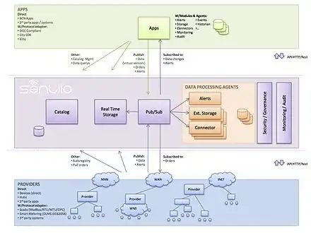 Sentilo could be used for other Internet of things applications. Cisco Systems promoted the CityOS project and Sentilo in 2014.[3] Also in 2014, Spanish company Libelium announced they would use it with their sensors.[4] In 2016, some initial tests were discussed.[5] It can be on-premises software or a platform as a service using cloud computing from OpenTrends called Thingtia, announced in January 2017.[6]