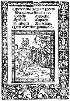 Because Serafino chanted his poems to his own lute accompaniment and often improvised the words as part of his performance, texts were taken down by others at the time and spread in manuscript, or sometimes in print. Definite attribution to him was therefore difficult later, as was establishing a definitive text. It was not until after his death that a first edition of his works appeared from Rome in 1502, to be followed by some twenty more in the next ten years alone.[2] Ultimately they ran into many more during the time his reputation was high. Of the 391 poems ascribed to him, 261 are strambotti and 97 are sonnets.