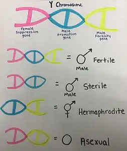 Different combinations of the genes present in a Silene Y chromosome affect the sexual expression in the organism. For example, there are two genetic variations that can lead to male sterility in S. latifolia: if it possesses two Y chromosomes (YY) or if the Y chromosome possesses the female suppression and male promoting genes. Silene are also susceptible to a type of sexually transmitted infection that causes sterility. Another possible combination includes the presence of all three sex-linked genes (male suppressing, female suppressing, and male promoting) which produce virile male offspring. The flower is hermaphrodite when both male promoting and male fertility genes are present. Lastly, Y chromosomes carrying both female suppression and male fertility genes creates an asexual organism.[7]