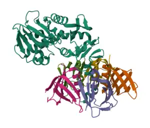 Shiga toxins are a family of related toxins with two major groups, Stx1 and Stx2, expressed by genes considered to be part of the genome of lambdoid prophages.[1] The toxins are named after Kiyoshi Shiga, who first described the bacterial origin of dysentery caused by Shigella dysenteriae.[2] Shiga-like toxin (SLT) is a historical term for similar or identical toxins produced by Escherichia coli.[3] The most common sources for Shiga toxin are the bacteria S. dysenteriae and some serotypes of Escherichia coli (STEC), which includes serotypes O157:H7, and O104:H4.[4][5]