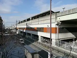 The station consists of two elevated island platforms serving three tracks, with the station building located underneath.