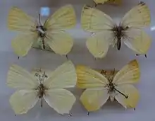 Above the butterfly is uniformly orange yellow, with only the extreme apex and the tail black. The white discal line is single, and proximally shaded with dark; the discocellular line is likewise dark and single.