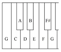 A later composer who wrote music conveniently playable only on a broken-octave instrument was Joseph Haydn, whose early work for keyboard was intended for harpsichord, not piano.[6] As Gerlach (2007) points out, Haydn's "Capriccio in G on the folk song 'Acht Sauschneider müssen sein'", H. XVII:1 (1765) is evidently written for a harpsichord employing the Viennese bass octave. The work terminates in a chord in which the player's left hand must cover a low G, the G an octave above it, and the B two notes higher still. On orthodox keyboards this would be an impossible stretch for most players, but as on the Viennese bass octave it would have been easy to play, with the fingers depressing keys that visually appeared as D–G–B (see diagram above).