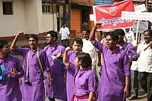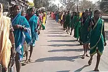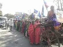- Through supporting its women's wing, Stree Mukti Sangharsh, Stri Mukti Sangarsh Calval (Women's Liberation Struggle Movement; after SMS) that was founded in March 1985 worked on issues of drought and water in Khanapur taluka of Sangli district. It took up the slogan of “hirvi dharti, stri shakti, manav mukti” (green earth, women's power, human liberation). Women in Stree Mukti Sangharsh came from general anti-drought movements and also took up issues as alcoholism, dowry deaths, atrocities against women, and discrimination on Employment Guarantee Scheme's[16] schemes. One of the worst issues faced women in the area were by deserted women came from all castes and communities. "Deserted women, cast-away women, thrown away women or parityakta- taklelya striya are different terms used interchangeably for women who are thrown out of their marital homes or in some cases who have chosen to step out themselves." SMS/SMD has led a long struggle with the deserted women 'parityaktas" to get plots of land from the government, land that was allotted to 'homeless' people. After decades of organizing they won the land. They continue to fight to keep the land.[17][18][19]