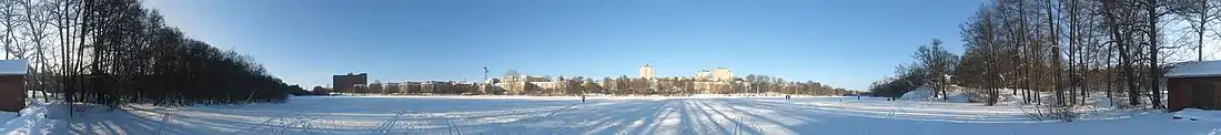 Sicklasjön, historically known as Långsjön ("Long Lake"), is connected to Järlasjön east of it through a narrow strait and to Hammarby Sjö west of it through the canal Sickla Kanal and the sluice Sickla Sluss. The lake, forming the northern border of the Nacka Open-air Area (Nacka friluftsområde, colloquially known as Nackareservatet, "Nacka [Nature] Reserve"), is considered as of significant recreational and natural value.[1] Water flow is periodically important but inconsiderable during summers when the lake remains relatively stratified.[3]