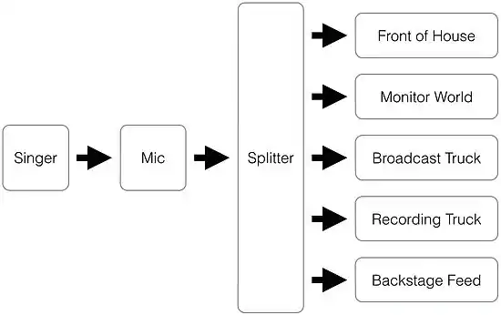 In this example, we will explore the signal flow of a hypothetical rock concert. For our example, this concert not only has a live audience, it is also being broadcast on live TV, and it is being recorded, with copies of the recording being sold to the public immediately after the concert is over. The signal from each microphone is therefore being sent to five places; the house sound system, the in-ear monitor system for the performers, the broadcast system, the recording system, and to the lobby, restrooms, and backstage areas so that people can hear the performance while outside the performance area.