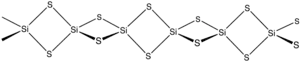 The material is formed by heating silicon and sulfur or by the exchange reaction between SiO2 and Al2S3. The material consists of chains of edge-shared tetrahedra, Si(μ-S)2Si(μS)2, etc.[2]