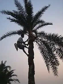 Phoenix sylvestris (sylvestris - Latin, of the forest) also known as silver date palm, Indian date, sugar date palm or wild date palm,[2] is a species of flowering plant in the palm family native to southern Pakistan, most of India, Sri Lanka, Nepal, Bhutan, Myanmar and Bangladesh. It is also reportedly naturalized in Mauritius, the Chagos Archipelago, Puerto Rico and the Leeward Islands.[1] Growing in plains and scrubland up to 1300 m above sea level, the fruit from this palm species is used to make wine and jelly. The sap is tapped and drunk fresh or fermented into toddy. The fresh sap is boiled to make palm jaggery in West Bengal state of India and Bangladesh.