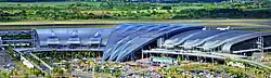 The new terminal, which cost US$306 million, is in line with the "Maurice Ile Durable" concept. Environmental and ecological aspects taken into consideration include using solar energy collected by photovoltaic cells, recovering rain water, integrating nature to the heart of the building, and including thermo-insulated facades to reduce heat gain.[5] The terminal covers an area of 57,000 square meters and is equipped with five boarding gates with airbridges, including one compatible with the large Airbus A380, check-in desks for departing passengers, immigration counters, and baggage carousels.[6]