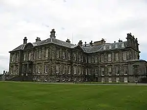 Moray later served on the Treasury Commission for Scotland, as did Alexander Bruce, now Earl of Kincardine. Bruce reported to this Commission as a revenue collector, and benefited from the patronage of its members.[5] The Commission had responsibility for the King's Works, and in 1667 Bruce was appointed Superintendent and Overseer of the Royal Palaces in Scotland. Four years later he was made Surveyor General of the King's Works in Scotland, with a salary of £3600 Scots (£300 Sterling, or £ 52,000 in 2024), for the purpose of rebuilding Holyroodhouse.[1] In March 1671, Bruce was part of a syndicate which bought the rights to collect taxes over a five-year period, paying £26,000 Sterling (£ 4.5 million in 2024) for the privilege. As such, it would appear that Bruce was not only the architect of Holyroodhouse, but one of the principal financiers of the £21,000 project.[5]