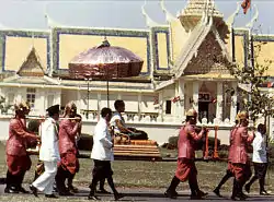Queen Kossamak on a palanquin in the inner court, behind is the Khemarin Palace
