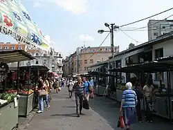 Predating the market was a kafana "Bajlonov Kladenac" (Bajloni's water well).[66] The market developed spontaneously in the 19th century for the customers from the lower Dorćol neighborhood, for whom the central city market, the Great Market, was too distant and uphill. It was established on an empty lot in front of the Filip's Brewery, which was later renamed to Bajloni Brewery.[67] Due to his brewery, and a fact that he organized the draining of the marsh, after World War I the market became known as the Bajloni Market (Bajlonijeva pijaca).[65] In 1926 the Great Market was finally closed and city founded several new markets throughout the city, further from the downtown: Zeleni Venac, Kalenić and Jovanova market.[68][69] In the process, the Bajloni market was also adapted that year: it got new market stalls, a fence, quality stores for the meat, eggs and dairy products and improved hygiene.[67] After re-opening in 1927 it originally functioned as the wholesale market, becoming a retal farmers market after World War II.[70]