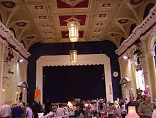 In 1895, upon the creation of Skipton Urban District Council, the building was purchased to replace the former town hall situated on Sheep Street.[2][6] During the 19th century a glass canopy was built onto the front of the Town Hall and lasted until the 1950s, and in 1935 the hall was made larger to accommodate more office space.[2][5] In 1974 when the Craven District Council was formed and moved the museum from its previous location at the library to the first floor of the town hall annexe, and a professional museum team were hired to run the museum.[5] Also located in the town hall is the council chamber where for over 100 years the urban district council and now the craven district council have held meetings.[5] A point of interest in the chamber are the benches and chairs which were made by the legendary furniture maker Robert Thompson also known as the "mouseman".[5][7][8]