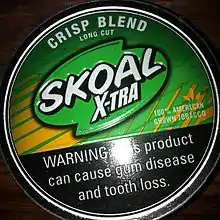 Skoal is an American brand of smokeless tobacco. First produced by the U.S. Smokeless Tobacco Company (USSTC) in 1934, Skoal is considered a high-priced product within the dipping tobacco market. "Skoal" is an Anglicization of skål, a term used often in Scandinavia to announce a toast of friendship, with connotations of well-wishing.