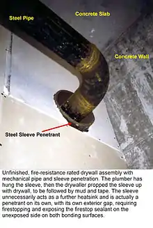 - Metallic sleeves are heatsinks in the firestop that follows the mounting of the penetrants. Maximum and minimum tolerances for wall thicknesses must be taken into account prior to casting. Heatsinks can affect T-ratings. Organic sealants used for topcaulking in firestops may let go of the sleeve if it has conducted too much heat through to the unexposed side (as in the case of the fire test article, this picture).