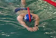Finswimming is competitive swimming using fins. The surface disciplines also use a snorkel. Finswimmers generally use a front-mounted snorkel for lower drag and stability at speed. The rigid forehead bracket and central position minimise off-centre loads and keep the snorkel stable at relatively high speeds. They do not normally use snorkels with a sump valve, as they learn to blast clear the tube on most if not all exhalations, which keeps the water content in the tube to a minimum, and the tube can be shaped for lower work of breathing, and elimination of water traps, allowing greater speed and lowering the stress of eventual swallowing of small quantities of water, which would impede their competition performance.[18] .