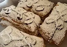 A mille-feuille—also known as "napoleon", "vanilla slice", and "custard slice"—is a dessert of French origin made of puff pastry layered with pastry cream.[9][10]