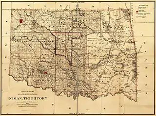 The "Oklahoma lands" — the entire future state of Oklahoma with the exception of the narrow western panhandle — were first set aside as a site to which Native American populations were to be deported from their ancestral homelands in the 1830s.[1] It was there that the so-called "Five Civilized Tribes" — the Cherokee, Seminole, Choctaw, Chickasaw, and Muscogee (Creek) peoples — were relocated at that time, clearing the way for European-American colonization of their previous lands.[1] Following the conclusion of the American Civil War the Federal government used the fact of these five Native American peoples' support of the Confederate States of America as a pretext for retaking approximately half of these "Oklahoma lands."[1] This freed new area for additional forced relocations of other Native American peoples.[1]