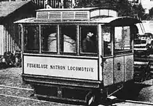 These closed-loop steam engines had no firebox. The boiler was jacketed by a container loaded with about 5 tons of caustic soda (sodium hydroxide). When water or steam came in contact with the caustic soda, it would generate heat—enough to actually run the boiler and generate more steam. Steam emanating from the boiler would be fed through pistons to propel the locomotive forward, and the exhaust steam from the pistons would be fed into the caustic soda to continue the cycle. These vehicles were virtually silent, because the steam was not released into the atmosphere.