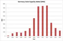 Since the end of the boom period, national PV market has since declined significantly, due to the amendments in the German Renewable Energy Sources Act (EEG) that reduced feed-in tariffs and set constraints on utility-scaled installations, limiting their size to no more than 10 kW.[26]